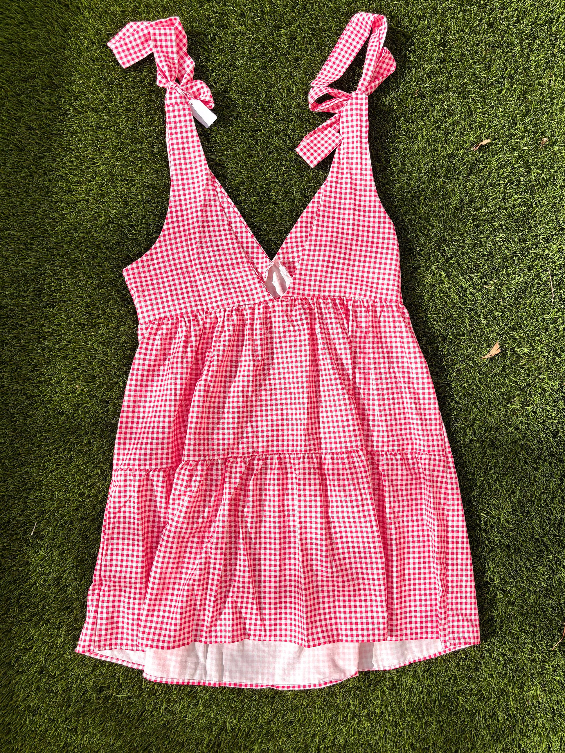 Experience the playful charm of our Magnolia Mini Dress, featuring tied straps and a vibrant red gingham print. Perfect for adding a touch of fun and personality to any occasion!