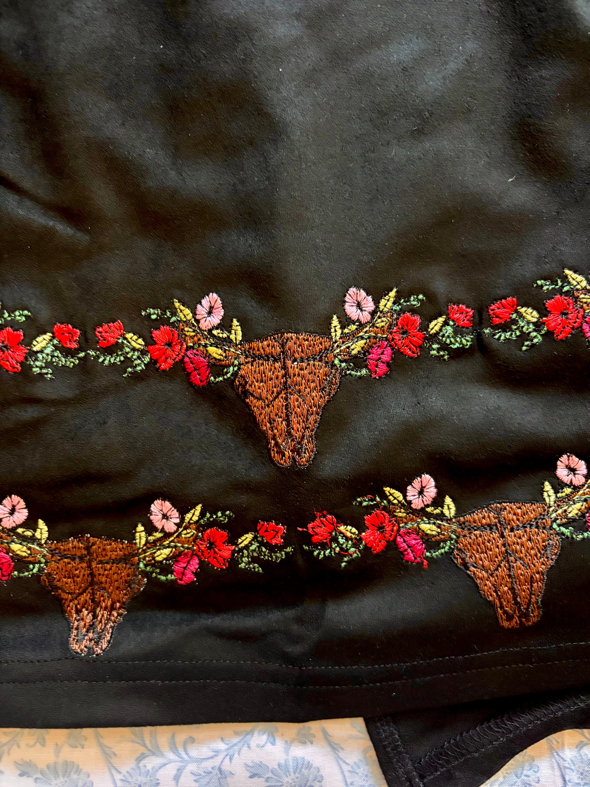 This playful black skirt, adorned with western embroidery, is ideal for date nights or a fun night out with friends—get ready to steal the spotlight!