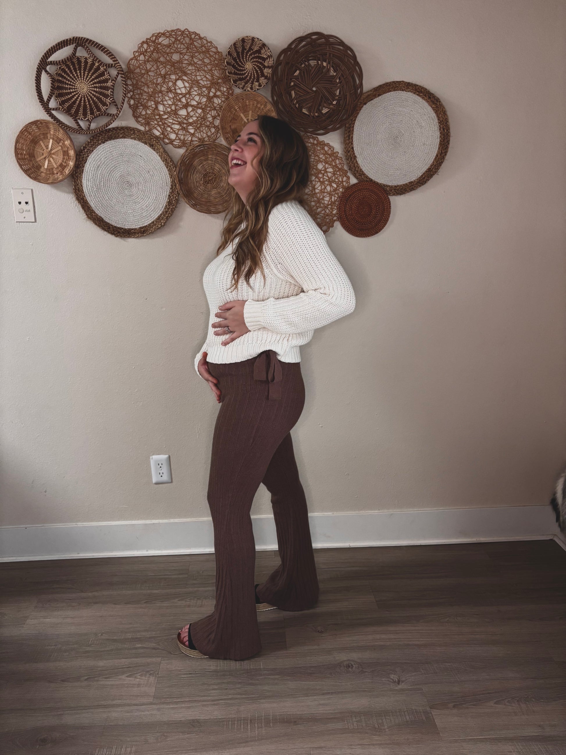 These solid, ribbed knit pants come with a comfy banded waist and a cute side self-tie. Featuring fun bell bottoms and a relaxed fit