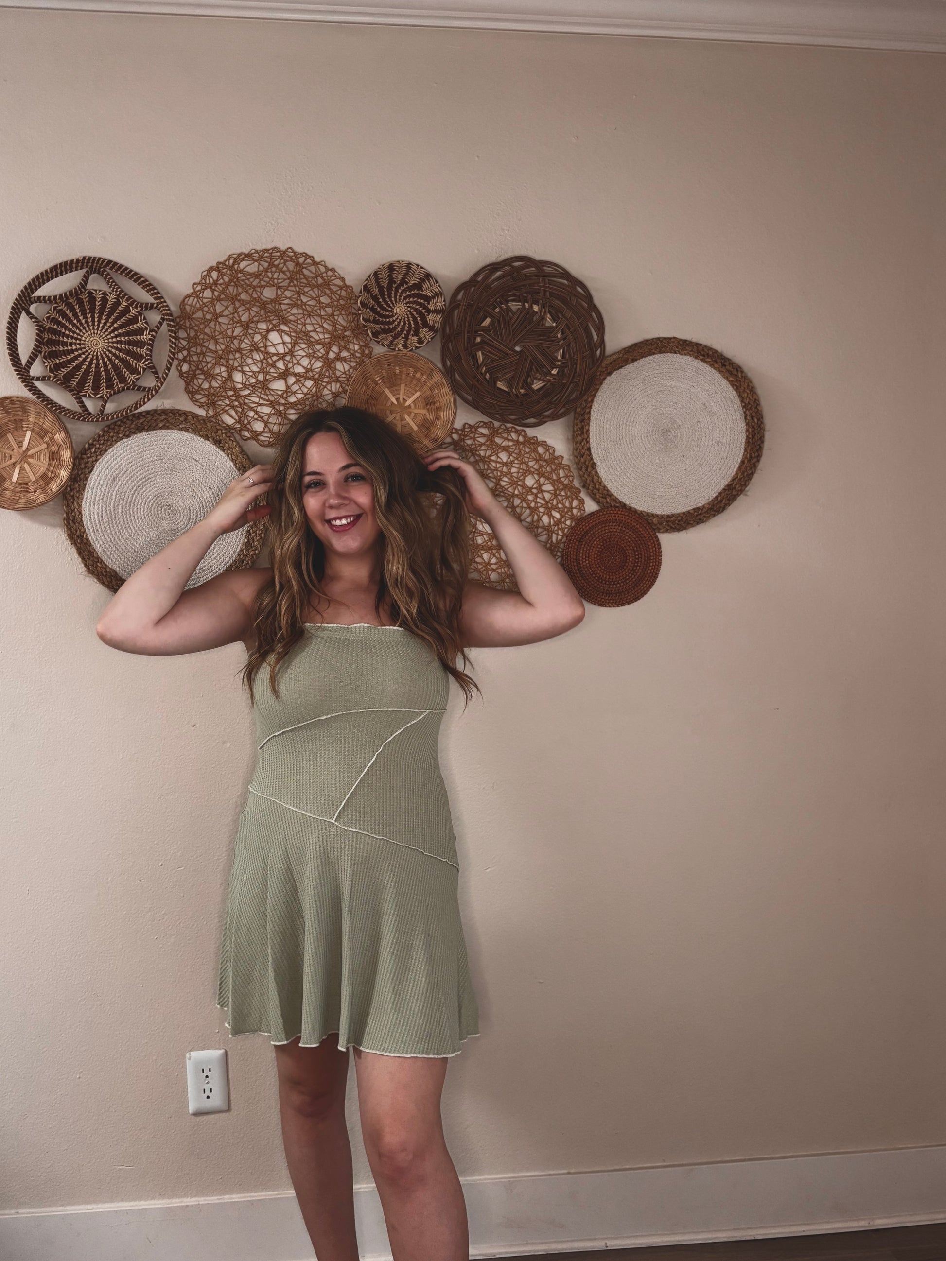 This fun and flirty waffle knit mini dress offers a straight neckline and delicate lettuce-edge accents. It’s sleeveless with adjustable cami straps, showcasing a low back and stylish exposed seams. The A-line shape falls to the thigh with a relaxed, breezy fit